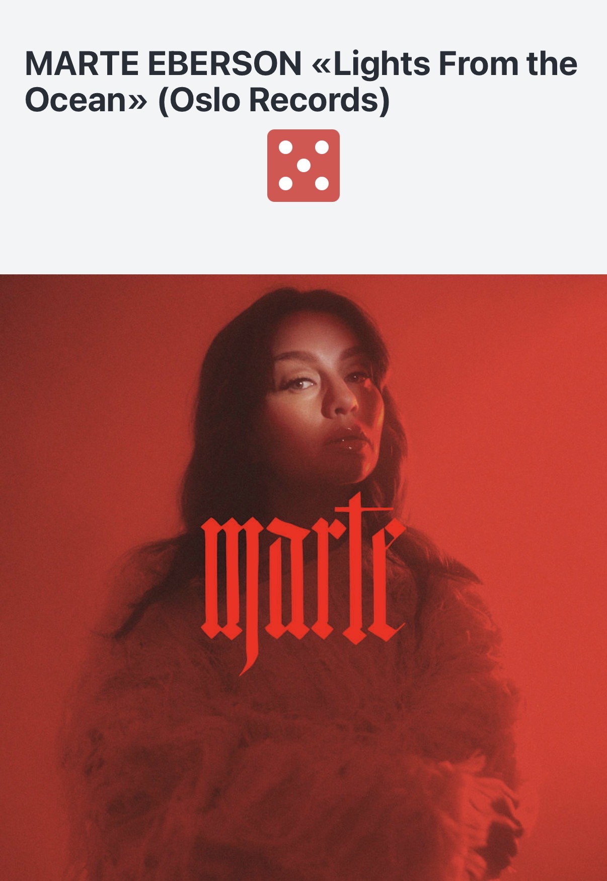 5/6 "Marte Eberson er en av de aller, aller mest spennende stemmene i norsk popmusikk. Her kommer det nok et strålende prov på det." Nettavisen